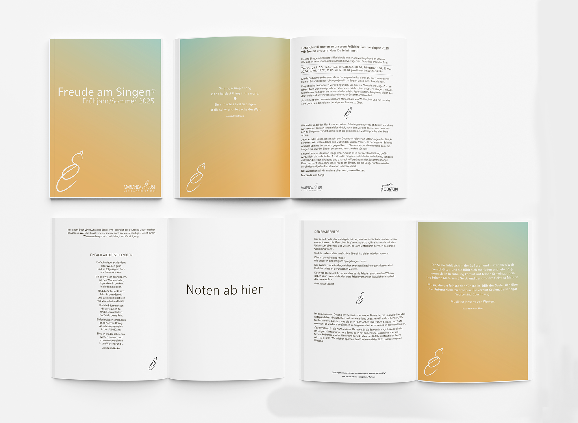 Frische Farben und ein ruhig, minimalistisch gesetzter Text strukturieren die Seiten und rahmen Noten, Sprüche und Gedichte, ohne von ihnen abzulenken. Die Gestaltung unterstützt das gemeinsame Singen und schafft eine klare visuelle Ordnung innerhalb des Hefts.