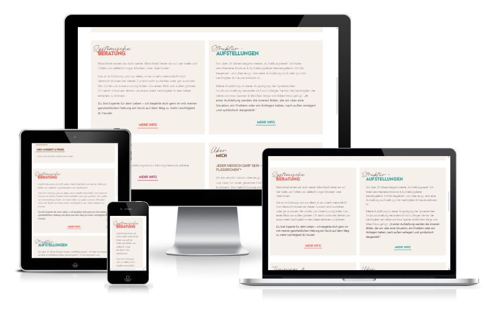 Die Website wurde mit WordPress und Elementor Pro umgesetzt und basiert auf individuell entwickelten Custom Templates. Gestaltung, Typografie und Farbkonzept greifen ineinander und unterstützen sowohl die beratende Rolle als auch den offenen, positiven Charakter von Cornelia Fuchs-Reiter. Ziel war eine charakterstarke Website, die Vertrauen schafft, Orientierung gibt und sich klar von klassischen, zurückhaltenden Beratungsauftritten abhebt.