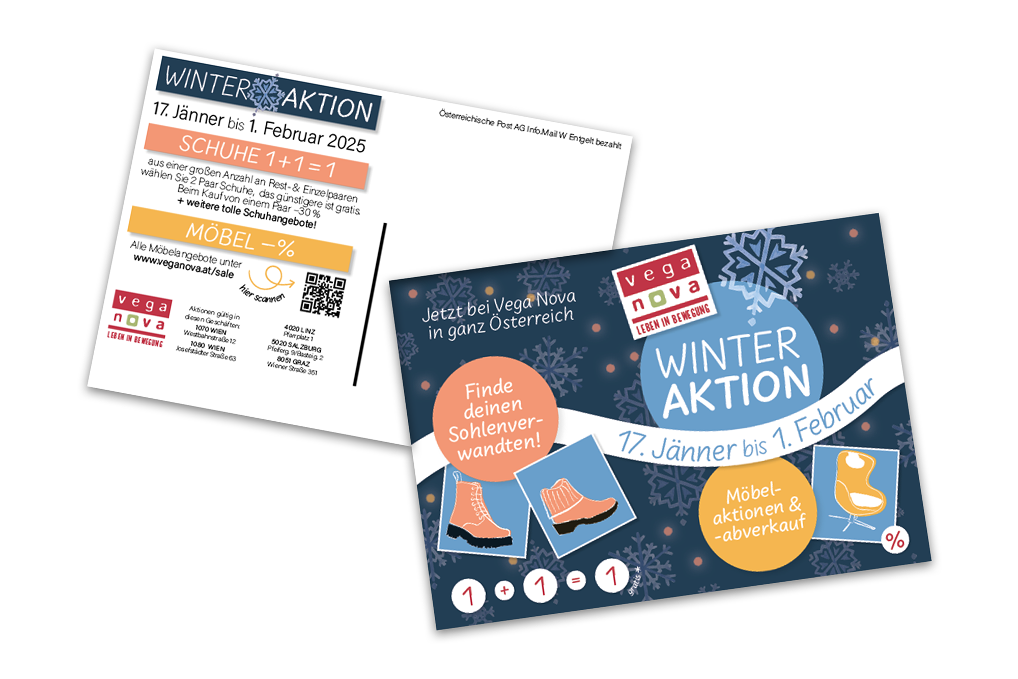 Für Vega Nova gestalte ich die Sommer- und Winteraktionen, die zweimal jährlich umgesetzt werden. Zentrales Element sind gedruckte Aktionskarten, die per Post an Kund*innen versendet werden und aktuelle Angebote sichtbar machen.